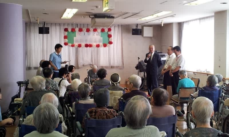 平成24年9月6日(木)9時20分より、やよい苑で入所されている入所者様が来年の3月に102歳を迎えるにあたり、岩出市より祝品の贈呈があるとのことでしたので『102歳を祝う会』を開催させていただきました。