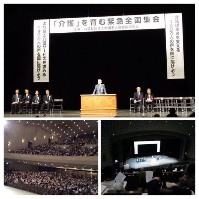 この緊急集会は、昨年10月に財務省が打ち出した「介護報酬の6%カット」方針に反対すべく全国老人保健施設協会が実施し、1,408,623筆もの署名を集め提出された「介護従事者の生活と人生を守り、利用者へのサービスの質を確保するための署名」をより一層に反映し、活動の集大成として同協会の主催により開催され、2000人以上の参加者が集まりました。