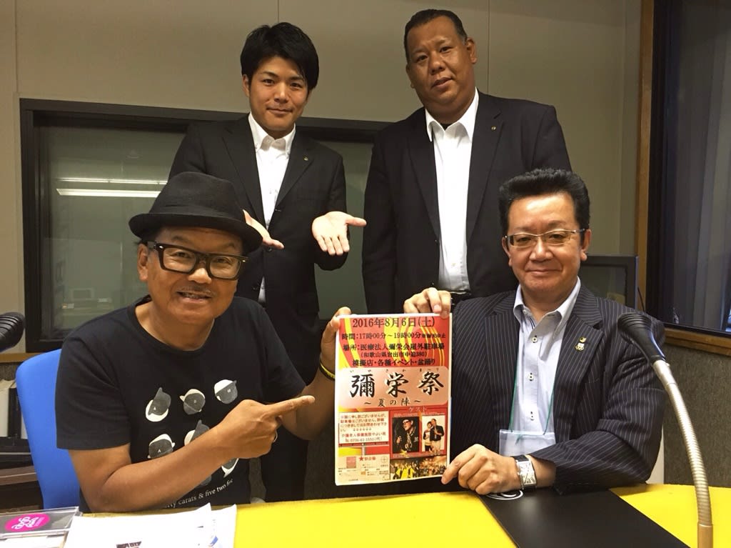 彌栄祭にご出演いただくTONPEIさんがラジオパーソナリティを務めている【TONPEIの今夜もうたWAナイト】のラジオ収録に当法人の和田本部長、彌栄祭実行委員長の長谷川センター長と私 土井が出演いたしました。