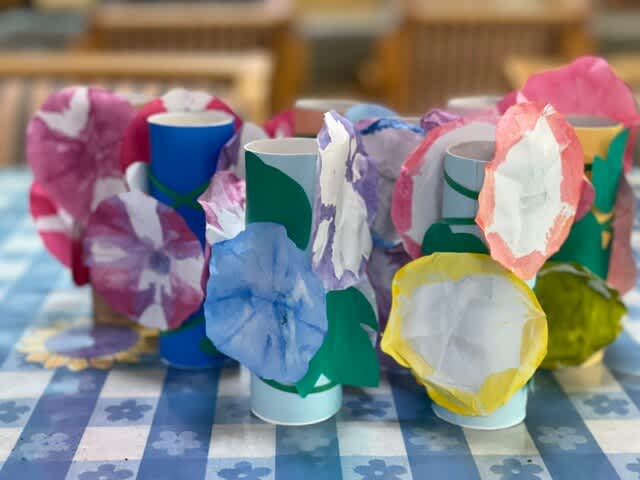 トイレットペーパーの芯に葉っぱとツルを貼り、半紙を好きな色の絵の具で染めて作った花を飾り付けました。
