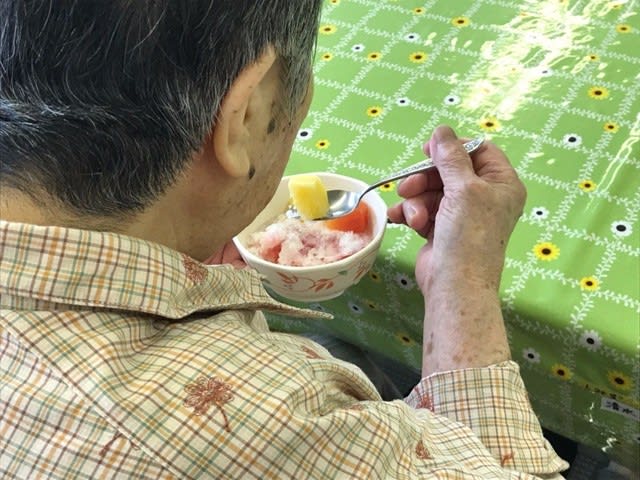 この瞬間を心待ちにされている入所者様へかき氷をお配りし、口に入れた瞬間の満足そうな笑顔は見ているスタッフの心も癒されました。