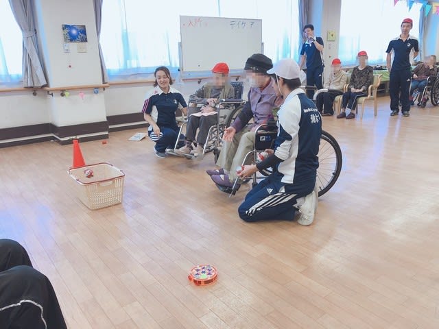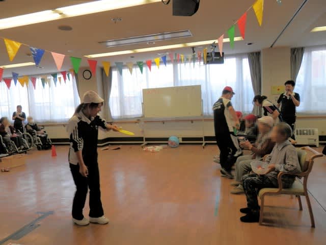 的当て・ピン倒し・玉入れと利用者様は一生懸命玉を投げておられ、ボールをのせて運ぶ競技は、スタッフも真剣で競い合っていました。