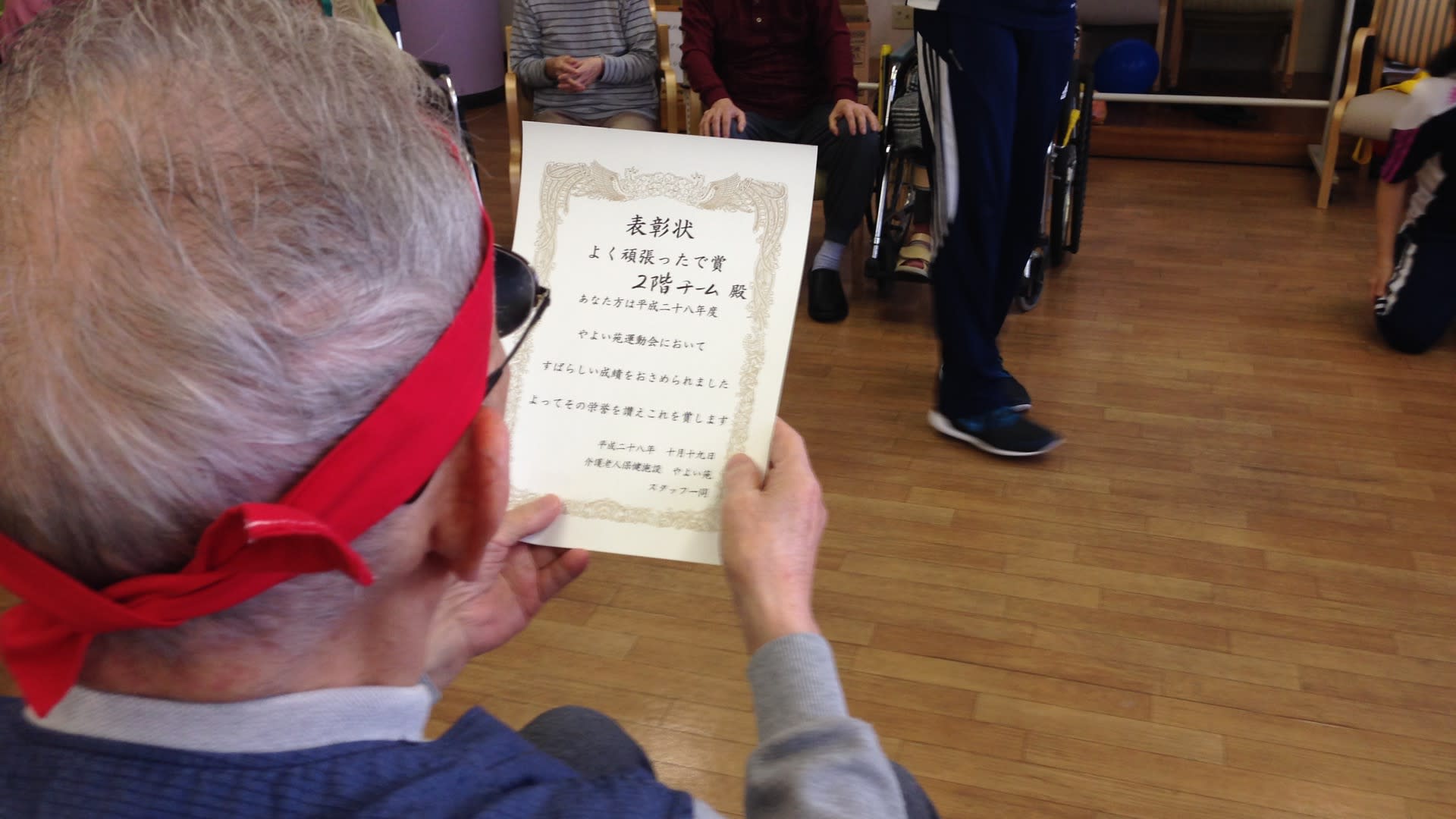 1年に1回行われるこの運動会は、2階・3階・デイケアの利用者様がそれぞれチームとなり勝負を行うチーム対抗戦で、各種目で1位~3位に応じてポイントが加算され、最終的にポイントの高いチームから【優秀賞】・【よく頑張ったで賞】・【頑張ったで賞】の表彰を行います。