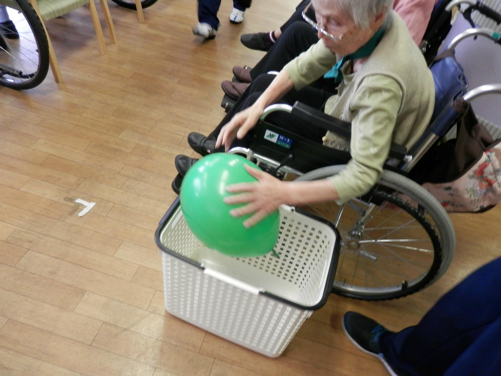 これは利用者様全員で楕円形を作り、チームそれぞれの色にあった球をお渡しし、中心にある籠へ投げ入れその合計数を競う競技。