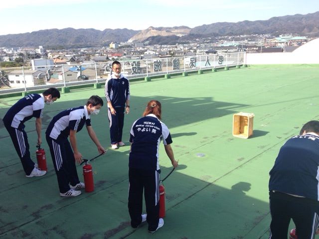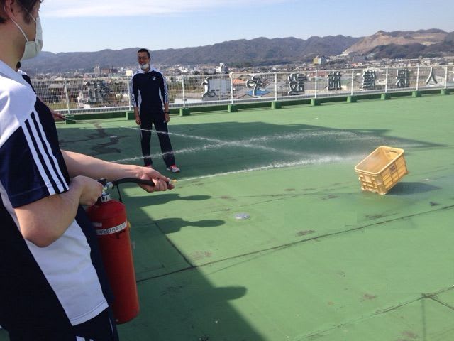 続いては、屋上へ移動し那賀消防署よりお借りした水消火器を使用しての訓練。