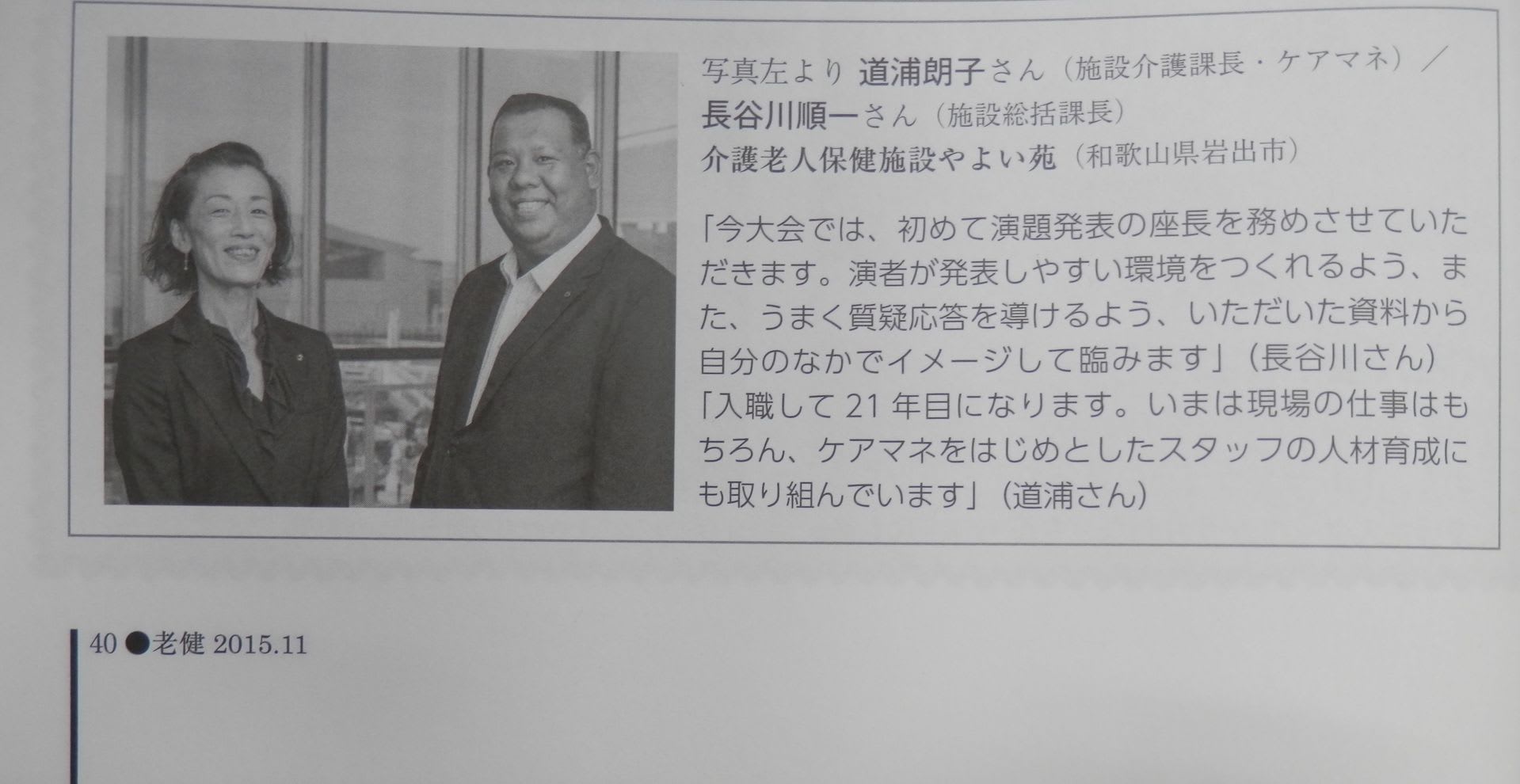 全国老人保健施設協会機関誌【老健】11月号において、第26回全国老人保健施設大会神奈川in横浜の<参加者インタビュー 参加者の声>コーナーにおいて同大会に参加された長谷川施設統括課長と道浦施設介護課長が掲載されました。