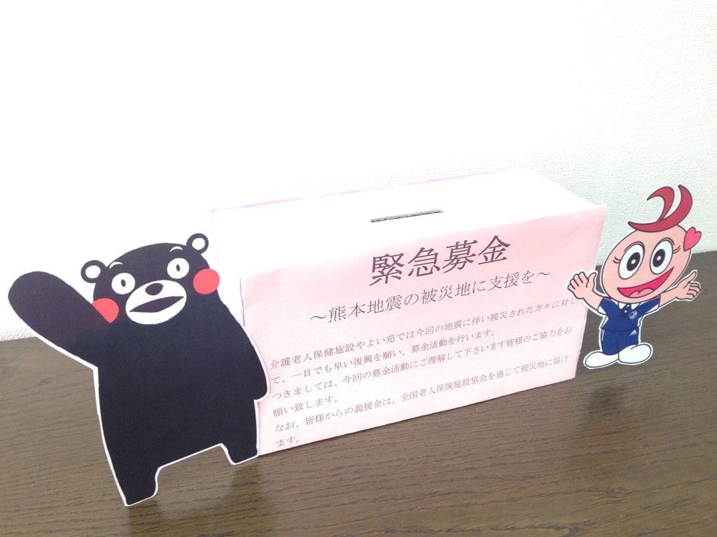 今回の地震で被災された方々に対して少しでもお役に立てるようにと、昨日からやよい苑の受付ロビーに緊急募金箱を設置させていただき、当法人職員を始め多くの方々からご協力いただいております。