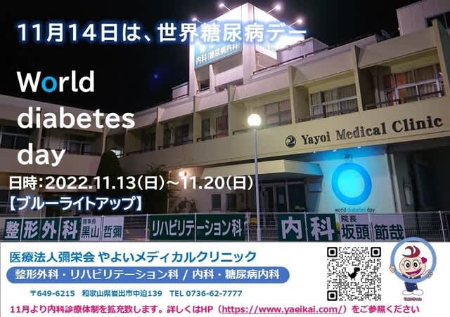11月14日の世界糖尿病デー、そして全国糖尿病週間(11/13~11/19)に合わせて当院では毎年ブルーサークルのライトアップを行います。
