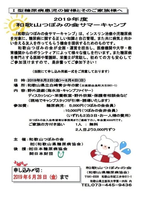 和歌山では和歌山つぼみの会(和歌山県糖尿病協会)が主催し、今年も8/2(金)~8/4(日)のスケジュールで日高郡の白崎青少年の家で2泊3日のキャンプを開催致します。