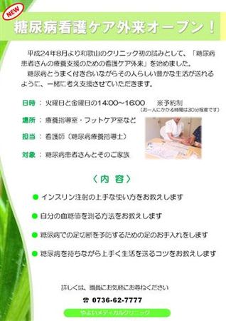 以前のブログにて、先月8月より当クリニックの内科部門にて看護師による『糖尿病看護ケア外来』開設のお知らせをさせていただきましたが、この度ホームページにも追加になりましたのでご案内申し上げます。
