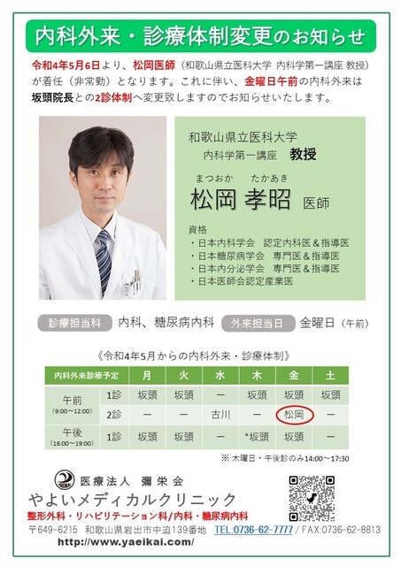 令和4年5月6日(金)より、和歌山県立医科大学 内科学第一講座 教授の松岡医師が着任(非常勤)となります。