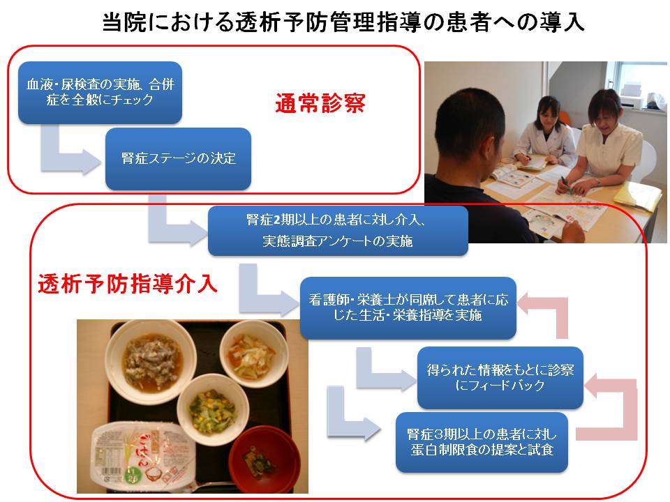 そこで、当院では糖尿病腎症を発症している患者さんに対し、医師・看護師・栄養士がチームで支援を行い、糖尿病腎症悪化防止のための糖尿病透析予防システムを構築しているところです。