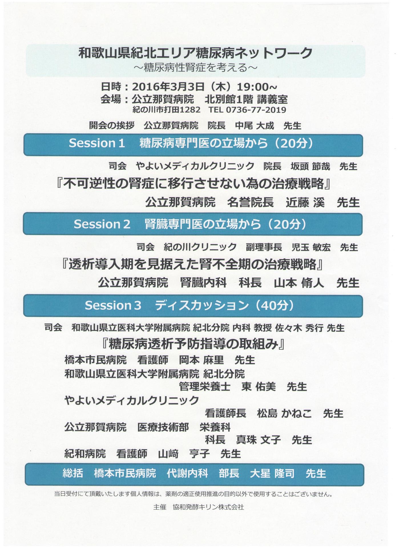 平成28年3月3日(木)公立那賀病院にて和歌山県紀北エリア糖尿病ネットワーク~糖尿病透析予防指導の取組み~が開催され、当院からもスタッフ皆で参加してまいりました。