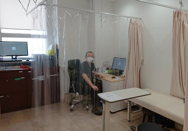 現在は従来の診察室の隣部屋で、点滴室として使用していた部屋を臨時の診察室として使用。もともと仕切り用のカーテンを吊り下げていた部分に透明のシートを設置。