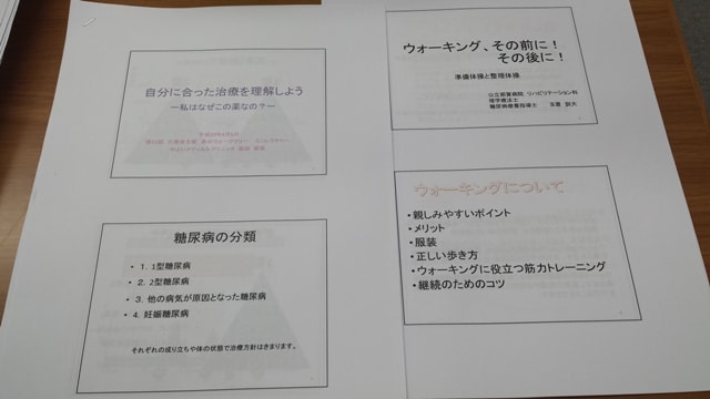 昼食後のミニレクチャーは、那賀病院 理学療法士の玉置先生による「ウォーキング、その前に!その後に!」という講演と、当クリニックの坂頭院長による「自分に合った治療を理解しよう-私はなぜこの薬なの?-」という2つの講演を聴き、糖尿病についての理解を深めていただきました。