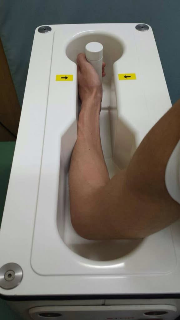 当院・やよいメディカルクリニックでは、骨密度を測定する検査機器を導入しており、検査では椅子に座り機器に片手を入れるだけで痛みもなく、時間も約1分~2分という短い時間で測定でき、患者様をお待たせすることなく検査結果をお知らせすることが出来ます。