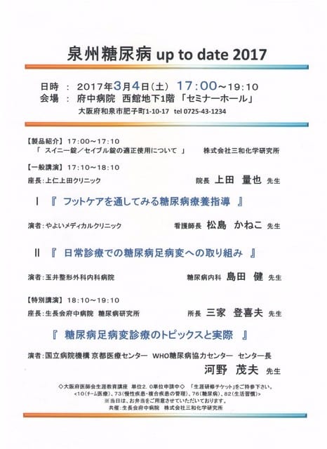 平成29年3月4日(土)17:00~19:10に大阪府和泉市の府中病院にて泉州糖尿病up to date2017が開催されました。