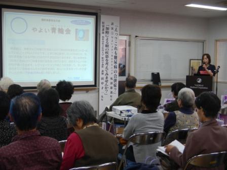 会場内では講演が始まるまでの間に、当クリニックの糖尿病療養指導士である平田看護師による、やよい青輪会(当クリニックの患者会)の活動報告・紹介をしてもらいました。