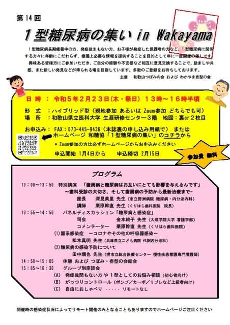 令和5年2月23日(木・祭日)、和歌山県立医科大学にて「第14回 1型糖尿病の集い in Wakayama(主催 : 和歌山つぼみの会・わかやま壱型の会)」というイベントが開催されます。