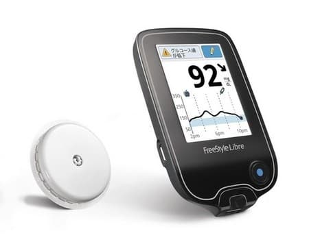 次に、腕に貼り付けたパッチに機械をかざすだけで、指先穿刺なしで血糖値を簡単にリアルタイムで(14日間)測定することができる血糖測定器について紹介。