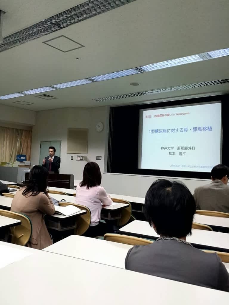 今回の特別講演の講師は神戸大学大学院医学研究科 肝胆膵外科病院准教授の松本逸平先生で、「1型糖尿病に対する膵・膵島移植」と題して移植に関する現状を非常に分かり易く解説していただきました。