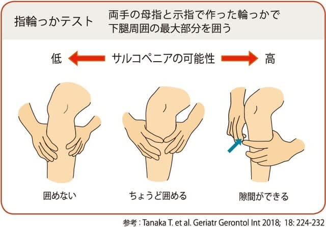 「囲めない」「ちょうど囲める」「隙間ができる」の順にサルコペニアの可能性が高まるほか、身体能力の低下や転倒歴との関係も認められると言われています。