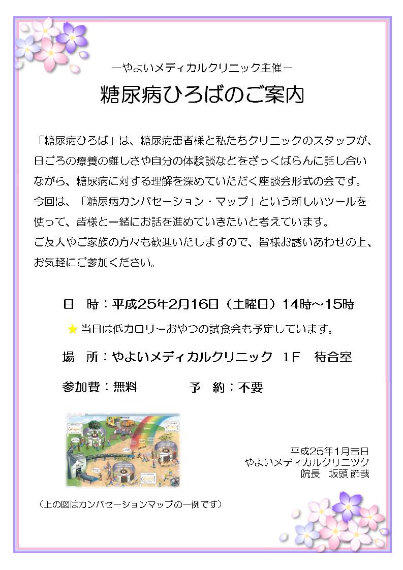 2月16日(土)午後2時から、クリニック1F待合室にて第4回目の「糖尿病ひろば(以前の”糖尿病座談会”から名称を変更)」を開催いたします。