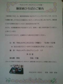 2月23日(木)午後6時から、クリニック1F待合室にて今回で第3回を迎えた「糖尿病ひろば(以前の糖尿病座談会から名称を変更)」を開催いたします。