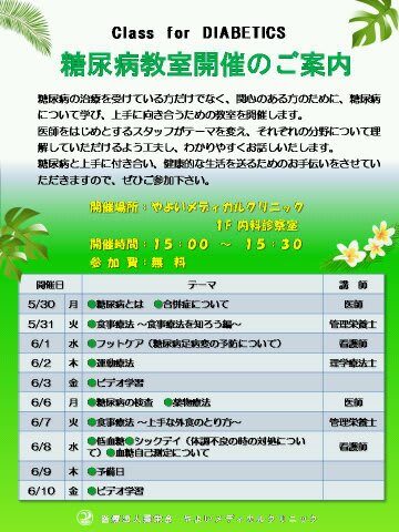 やよいメディカルクリニックでは、糖尿病の治療を受けている方だけでなく、関心のある方のために、糖尿病について学び、上手に向き合うための教室をはじめました。