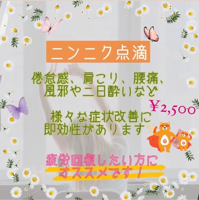にんにく点滴は血液に乗ってまんべんなく全身にビタミンを行き渡らせ、蓄積された乳酸を燃やし、新陳代謝を高め、残った疲労物質を洗い流してくれるため、症状改善に即効性があります。疲労回復したい方にお勧めです。