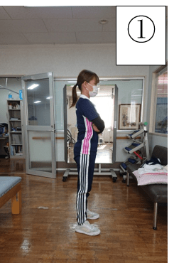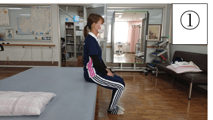 ①の姿勢から足を挙げて②の姿勢でキープ!!そしてゆっくり①の姿勢に戻ります。