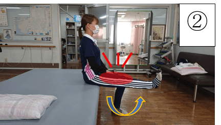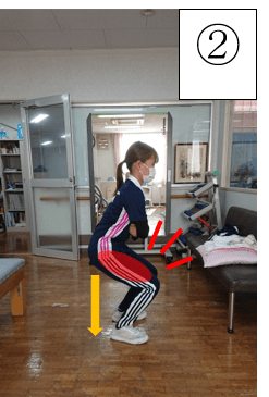①の姿勢からお尻を下ろして②の姿勢でキープ!!そしてゆっくり①の姿勢に戻ります。