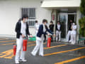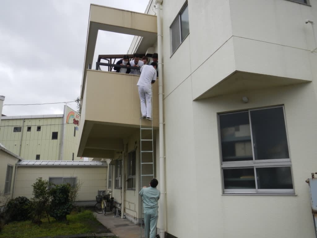 各器具の設置場所や取り扱いの説明を受けたあと、排煙装置の作動確認、避難梯子は代表して男性職員が2階から1階に降りる体験をしました。