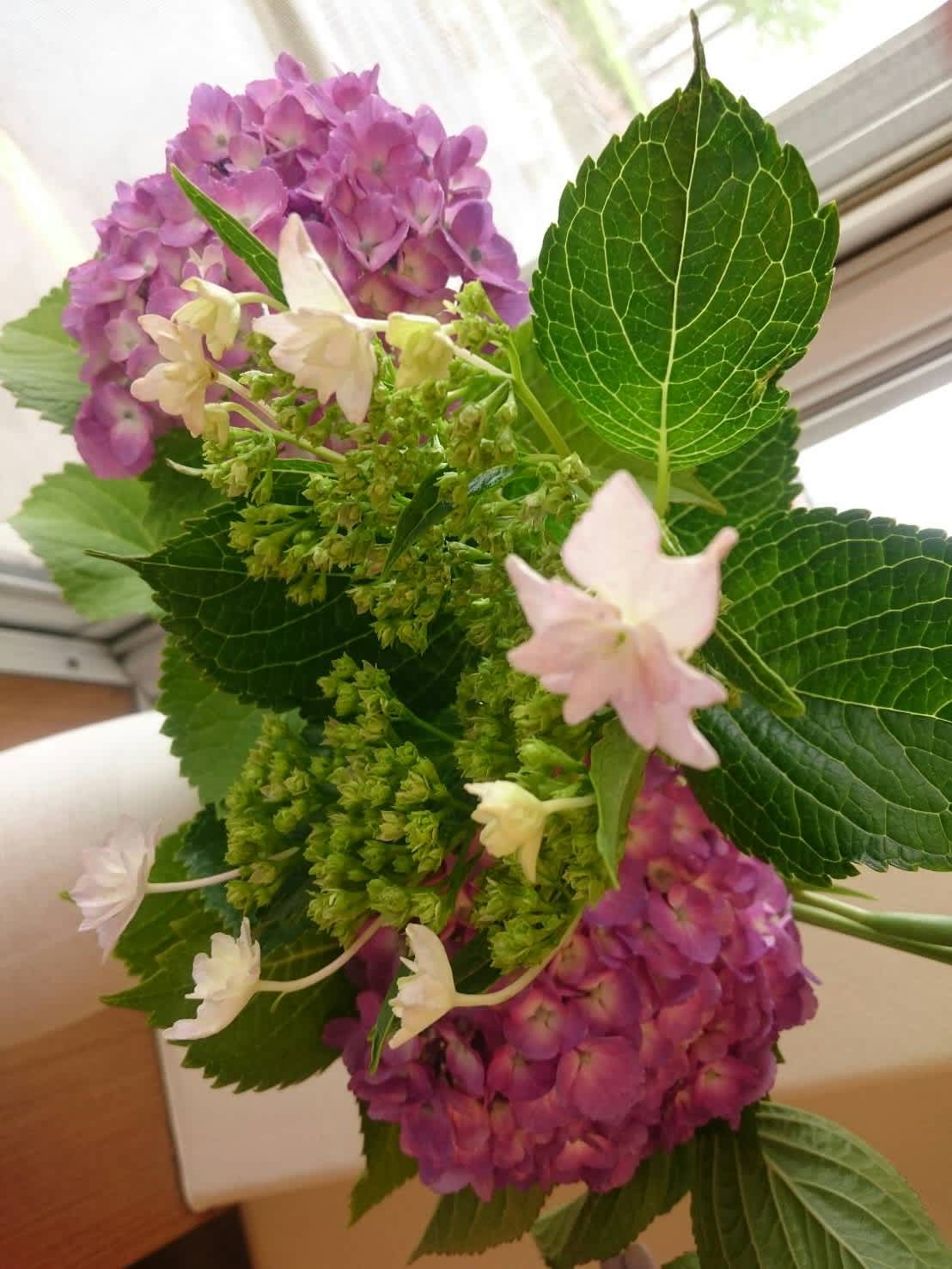 今まで何度も持ってきてくださっていますが、毎回とてもきれいで、紫色と白色の紫陽花をみているだけで本当に癒されます。