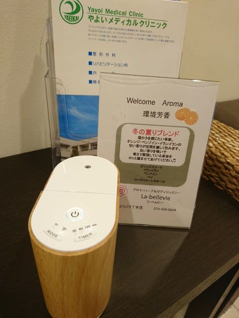 暖かさを感じたい季節に、オレンジ・ベンゾイン・イランイランの甘い薫りが院内を優しく包んでくれて、寒さで緊張している身体をホッと緩ませてくれるような感じです。