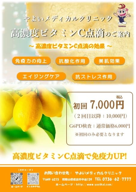 ※初めての方は点滴前にG6PD検査(料金:6,000円)が必要になります。G6PD欠損症の方に高濃度ビタミンC点滴を行うと重度の貧血を引き起こす可能性がありますので、事故を未然に防ぐため事前の検査の実施に予めご了承ください。