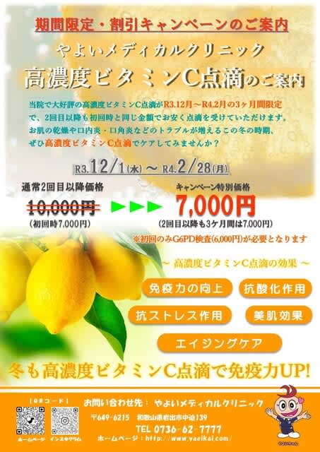 当院で大好評の高濃度ビタミンC点滴が12月から来年2月までの3ヶ月間限定で、