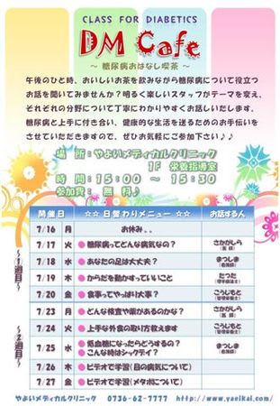 以下、DM cafe(糖尿病教室)7月17日(月)~7月27日(金)のスケジュールをお知らせ致します。
