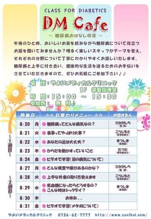 以下、DM cafe(糖尿病教室)8月20日(月)~8月31日(金)のスケジュールをお知らせ致します。
