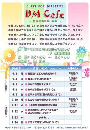 以下、DM cafe(糖尿病教室)9月3日(月)~9月14日(金)のスケジュールをお知らせ致します。