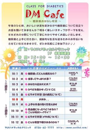以下、DM cafe(糖尿病教室)10月1日(月)~10月12日(金)のスケジュールをお知らせ致します。
