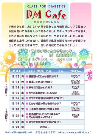以下、DM cafe(糖尿病教室)11月12日(月)~11月23日(金)のスケジュールをお知らせ致します。