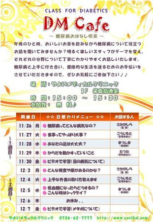 以下、DM cafe(糖尿病教室)11月26日(月)~12月7日(金)のスケジュールをお知らせ致します。
