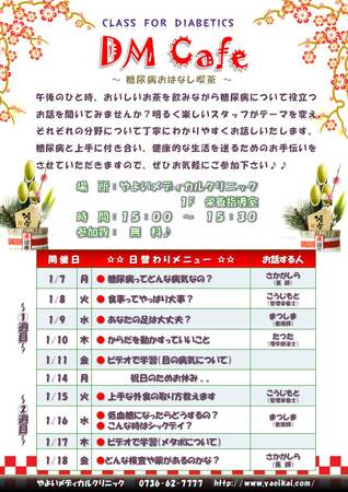 以下、今年第1回目のDM cafe(糖尿病教室)1月7日(月)~1月18日(金)のスケジュールをお知らせ致します。