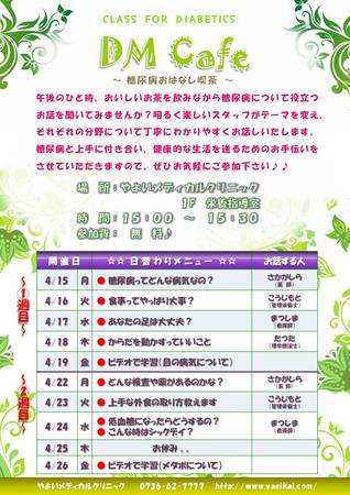 以下、4月中旬のDM cafe(糖尿病教室)4月15日(月)~4月26日(金)のスケジュールをお知らせ致します。