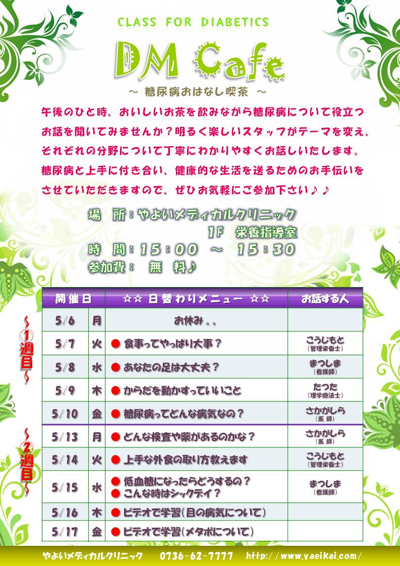以下、今週から開催されている5月最初のDM cafe(糖尿病教室)5月6日(月)~5月17日(金)のスケジュールをお知らせ致します。