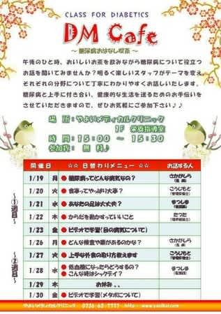 以下、1月のDMcafe(糖尿病教室)1/21(水)~1/30(金)のスケジュールをお知らせ致します。