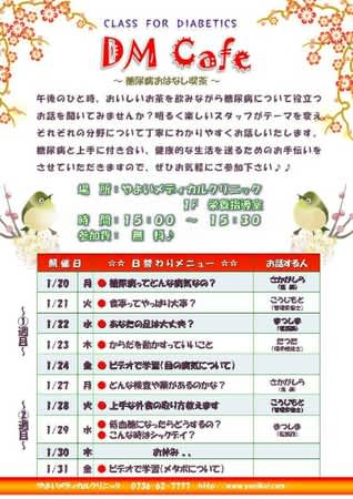 以下、1月後半のDMcafe(糖尿病教室)1/20(月)~1/31(金)のスケジュールをお知らせ致します。