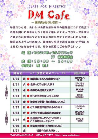 以下、3月のDMcafe(糖尿病教室)3/10(月)~3/21(金)のスケジュールをお知らせ致します。