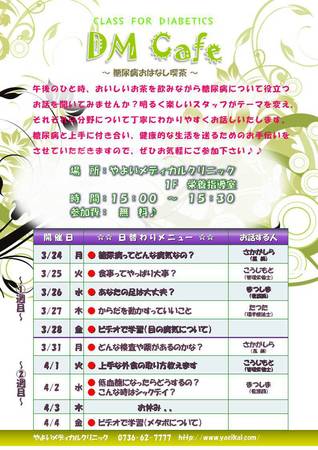 以下、3月のDMcafe(糖尿病教室)3/24(月)~4/4(金)のスケジュールをお知らせ致します。